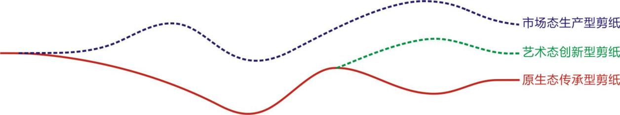 百年来,民间剪纸这条母亲河在多重文化手段迫力的作用下开始发生变异分叉。一条是民间剪纸作为一种独立的艺术样式存在。形式的自由度引领民间剪纸走向纯艺术状态,并在艺术家推动下使剪纸艺术创作呈现精英化倾向,即形成艺术态创新型剪纸。另一条是民间剪纸艺术经济属性的强化推动民间剪纸作为一种经济资源存在,并在市场的推动下使民间剪纸艺术创作呈现大众化色彩,即形成市场态生产型剪纸。第三条是传统民间剪纸艺术的本原之路,即原生态传承型剪纸之路。虽然传统民间剪纸生存语境已发生改变,但传统民间剪纸生存的文化空间并没有完全消失,不仅部分偏远农村仍保留有民间剪纸生存的文化土壤,而且民间文化自身的完整性和独立性也推动原生态民间剪纸沿着传统之路发展。可见,这条母亲河已从清末以前的“一体”格局裂变为“多元”共生状态。(图6-3)所以,面对当下民间剪纸艺术发展中的诸多窘境,应根据不同类型剪纸的价值取向分而视之,而不是将所有类型剪纸都纳入非遗剪纸保护的范畴,也不是以非物质文化遗产保护一把标尺来衡量当下所有类型剪纸的发展状况。