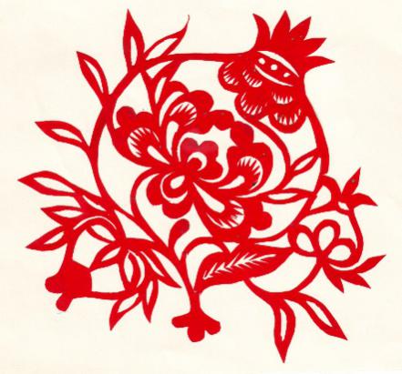 这类造型的产生,主要来源于民间对生殖、生命崇拜的观念信仰。在民间艺人心中,一切植物都是有生命的物体,于是便就有了“生命树”、“莲里生子”、“吐子之花”、“石山长出牡丹花”、“葫芦生子”、“石榴生子”等传统主题纹样系列。这些主题纹样也是采用剖面图示表现,有的运用“拟人化”手法,有的产生出“透视”效果,还有一些则是植物与人物的“复合形”。陕北剪纸中的《莲花娃娃》、《石榴娃娃》等植物与人体的复合造型,就颇具童话色彩,生动有趣,一派生机勃勃的盎然景象。