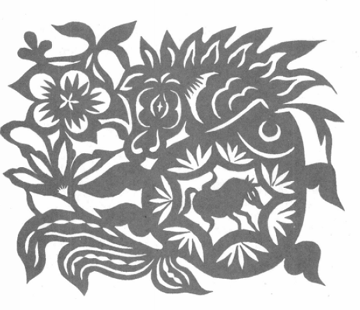 暗喻手法中的一些形象内涵则是较为隐密的,像是莲花喻女,喻阴,有生生不息之意;鱼喻阳,喻男,喻多子;蛙喻阴,喻女,喻月亮;鸟喻男,喻天,喻太阳等,这些物象不仅拥有其自身的寓意内涵,同时还代表着更深层次的文化指向。如,作品《鱼咬莲》并不单纯指代为表面上描绘的鱼咬莲花,而是借此暗指男女交合,是过去生殖崇拜的一种主题象征。“‘鱼儿绕莲’、‘鱼凤钻莲’、‘鱼儿卧莲’、‘鱼儿咬莲’、‘鱼儿吐娃’五种图纹,均为借鱼儿凤凰或蝴蝶、蜜蜂的动作——绕钻、卧、咬、吐,用隐语比拟的手法,巧妙地表达人类性爱繁衍的五种因果关系。将这五种图案联系在一起,实质上就是人类自身恋爱、做爱、拥抱、接吻、生育子女五种关系的示意图。”这种巧妙运用花卉图案组合来暗喻人们祈求子女良好夙愿的剪纸作品不胜枚举,还有像“二龙戏珠”“鱼儿窜莲”、“双鱼生娃”、“双猫卧莲” 等。