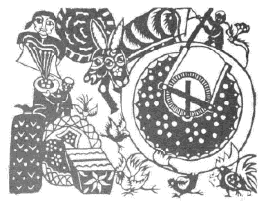 宇宙间万事万物生生不息、运动不止。作为自然物的人类,从他诞生之日起,日、月、星辰的运行就对他产生着不可替代的功利作用。太阳的东升西落,月亮的阴晴圆缺,原始先民伴其生存,也伴其喜、怒、哀、乐,并年复一年地重复着所谓“日出而作,日落而息”的生活,人类从此对生活中的自然生态有了切肤的感受。然而,若要在平面艺术造型中表现自然界中的时效与运动感却并非易事,民间艺术家不断的思考与实践,力图用理想营造新的现实,使“合理”让步于“表意”,从而共同探索出了这种非静止的物象造型方法。该方法的应用,不仅能表现人物和事物的多瞬间,也对事物发展的前因后果进行综合的叙述与描绘。